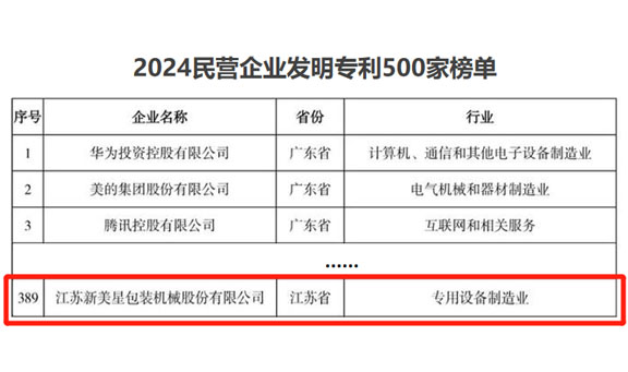 近日,2024年全國民營企業(yè)科技創(chuàng)新與標準創(chuàng)新大會在哈爾濱召開。會上,發(fā)布了2024研發(fā)投入前1000家民營企業(yè)創(chuàng)新狀況報告,以及一系列相關榮譽榜單、名單。新美星以卓有成效的發(fā)明專利成果順利入圍“2024民營企業(yè)發(fā)明專利500家”榜單。
